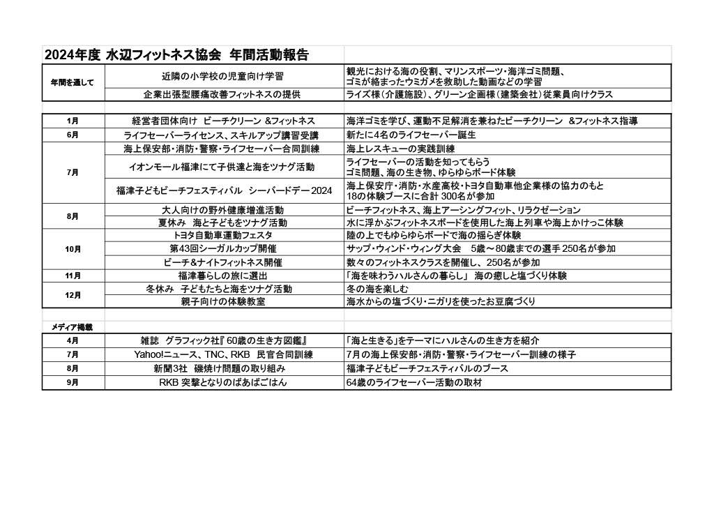 お知らせ 2024年度 年間報告 2024.12.28 2025.12.04 お知らせ 皆様のおかげで、2024年は様々な活動をすることができました🙏 また2025年も子どもたちと海をツナグ、未来に向けての教育活動を行ってまいります☺️ 福津の海から天然塩&お豆腐づくりワークショップ 前の記事 高校生向けに海のお仕事を語る 次の記事 関連記事 地域団体の社会貢献活動をサポート 2024.01.15 海のフィットネス法人会員について 2023.06.22 株式会社テレQ九州放送 番組「ふくおかサテライト」にSUPNESSが取り上げられました。 2019.07.22 テレビ放送のお知らせ📣 2025.02.22 水辺フィットネス協会の概要をまとめたPDFをアップしました。 2019.11.22 【ホームページをリニューアルしました】 水辺の魅力と活動を、より多くの方へ。 2025.10.19 【7/28子どもイベント】海に入るプログラムに参加する方へ 2024.07.14 福津こどもビーチフェスティバル!『シーバード2024』 2024.05.22
